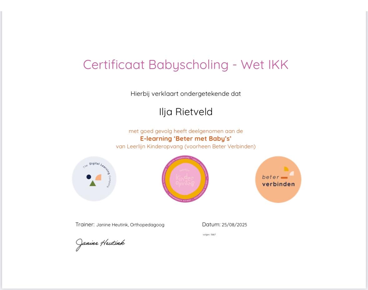Om mijn kennis verder uit te breiden en de ontwikkeling van jonge kinderen optimaal te ondersteunen, heb ik aanvullende opleidingen gevolgd. Zo heb ik een opleiding babymassage afgerond, waarmee ik ouders en baby’s kan begeleiden bij rust, ontspanning en hechting. Daarnaast heb ik de IKK Babyscholing gevolgd, zodat ik op de hoogte ben van de nieuwste inzichten en richtlijnen in de kinderopvang.